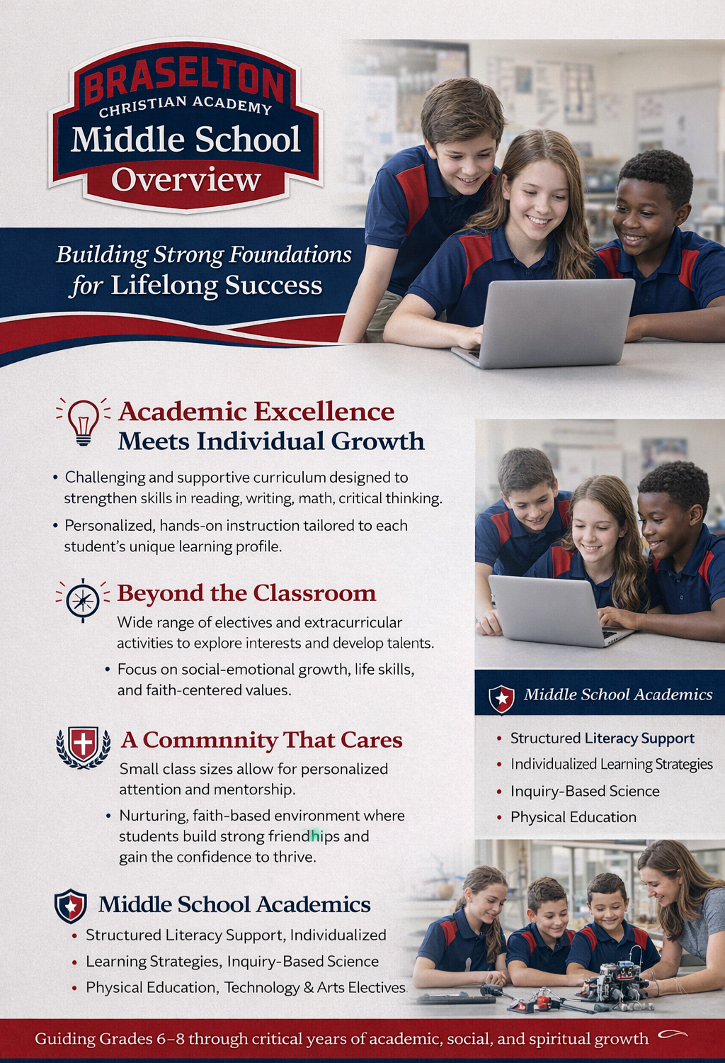 Middle school is more than a transition—it’s a turning point. At Braselton Christian Academy, we recognize that students in grades 6–8 need targeted instruction, emotional support, and strong mentorship as they grow academically, socially, and emotionally.